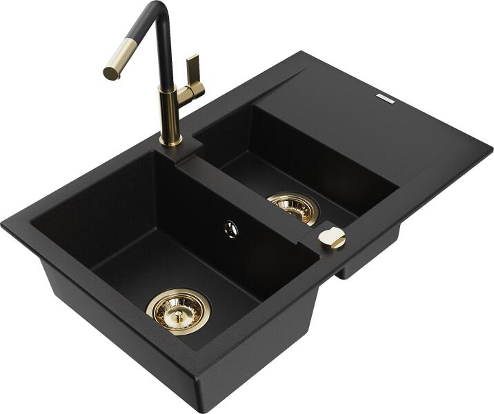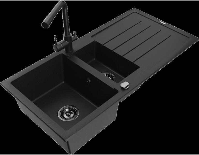 Gyártó: Mexen Sorozat: Bruno + Duo Mosogató: Mérete: 795x495x200 mm Kamra - mélység: 200 mm Kamra méretei: 440x360 mm Kimeneti átmérő: ø90 mm Típus: 1 kamrás csepegtetővel Mosogató típusa: a munkalapba való beágyazáshoz Anyaga: gránit (80% gránit adalékanyag 20% gyanta) Túlfolyó nyílás: Igen Lyukak: 2 (1 lyuk a mosogató csapjához, 1 lyuk az automatikus leeresztő