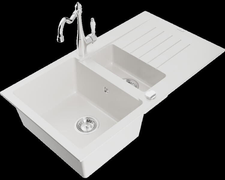 NERO Italia mosogató fehér színben. Hatalmas medencéjében, ami 54 x 39 cm és 20 cm mély, bármilyen edény könnyen tisztítható. Emellett egyedi formavilággal is rendelkezik, a kerekített ívek, kiválóan illenek klasszikus vagy akár modern konyhákba is. A mosogatón 2 lyuk található, egy a csaptelepnek és egy a beépíthető mosogatószer adagolónak vagy dugóemelőnek. Összet
