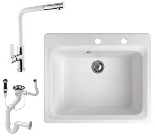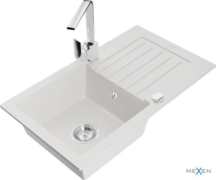 Mexen Pablo, gránit mosogató 752x436x161 mm, 1 kamrás és Rita króm csaptelep, fehér, 6510-20-670300-00 Gyártó: Mexen Sorozat: Pablo Mérete: 752x436x161 mm Kamra mélysége: 151 mm Kamra méretei: 356x332 mm Lefolyó átmérője: ø90 mm Fehér szín Típus: 1 kamrás csepegtetővel Típus: az asztallapba ágyazva Anyaga: gránit (80% gránit adalékanyag 20% gyanta) Túlfolyó lyuk: igen