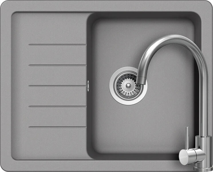 Schock Pinedo D-100XS konyhai mosogatótálca Cristalite Croma 620 x 500 mm, gránit, megfordítható, hagyományos beépítés, szürke - munkalapba beépíthető, 1 medence és csepegtető, megfordítható, ideálisan illeszkedik a minimum 45 cm-es alsószekrényhez. A csaptelep vagy más tartozék helye előre elkészített, könnyedén áttörhető. A csomagban találja a használati útmutat