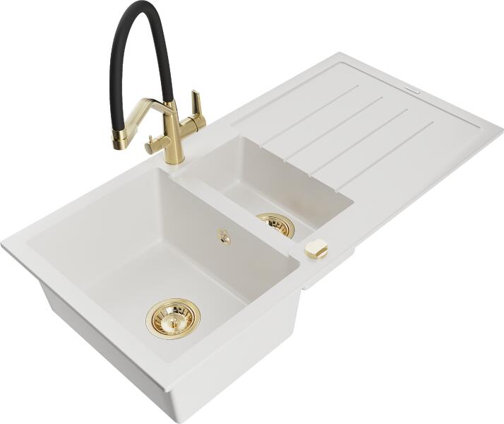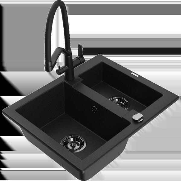 Mexen Andres, gránit mosogató 1000x500x200 mm, 1,5 kamrás Gyártó: Mexen Sorozat: Andres Modell: 1,5-kamrás lefolyóval Beépítés: felülről a munkalapba süllyesztve Hossza 1000 mm Szélesség 500 mm Magasság: 200 mm Kamra mélysége: 190 mm (nagyobb), 115 mm (kisebb) Kamra mérete: 430x330 mm (nagyobb), 340x170 mm (kisebb) Lefolyó átmérője: 90 mm Szifon + automatikus leeresztő csav