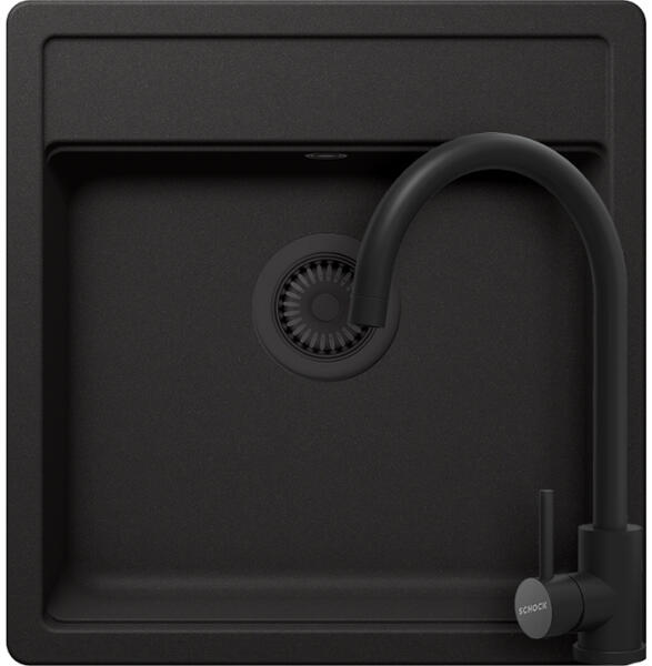 Schock Nemo N-100S konyhai mosogatótálca Cristalite Nero 490 x 510 mm, gránit, hagyományos beépítés, fekete munkalapba beépíthető, egymedencés, csepegtető nélküli, ideálisan illeszkedik a minimum 50 cm-es alsószekrényhez. A csaptelep helye előre elkészített, könnyedén áttörhető. A csomagban találja a használati útmutatót, amely részletes leírást ad a csaptelep hely
