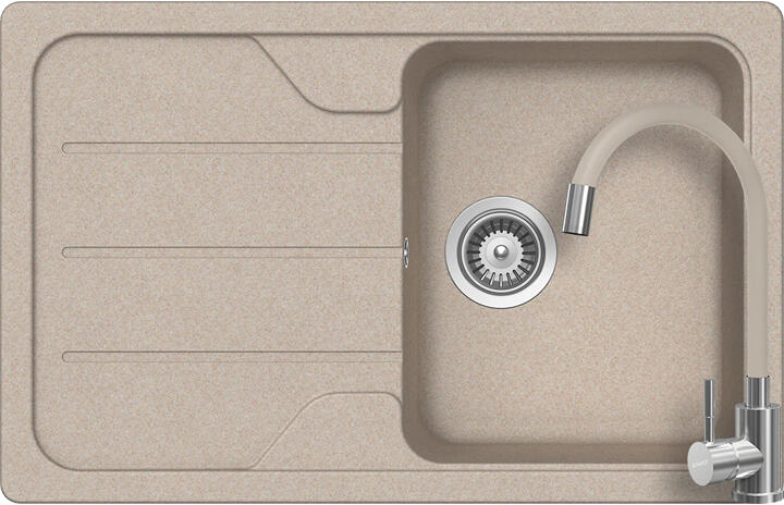 Schock Formhaus D-100S konyhai mosogatótálca Cristalite Sabbia 780 x 500 mm, gránit, megfordítható, hagyományos beépítés, homok munkalapba beépíthető, egymedencés, megfordítható, csepegtetővel ellátott, ideálisan illeszkedik a minimum 45 cm-es alsószekrényhez. A csaptelep helye előre elkészített, könnyedén áttörhető. A csomagban találja a használati útmutatót, amely