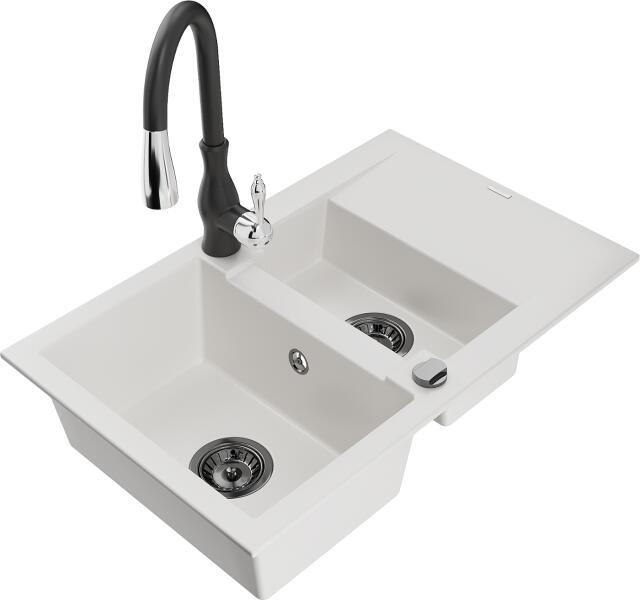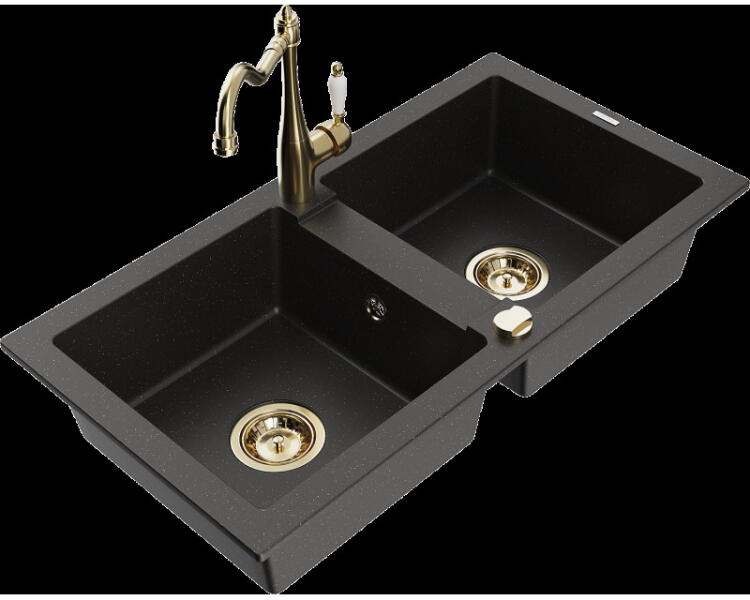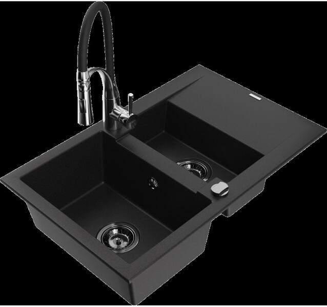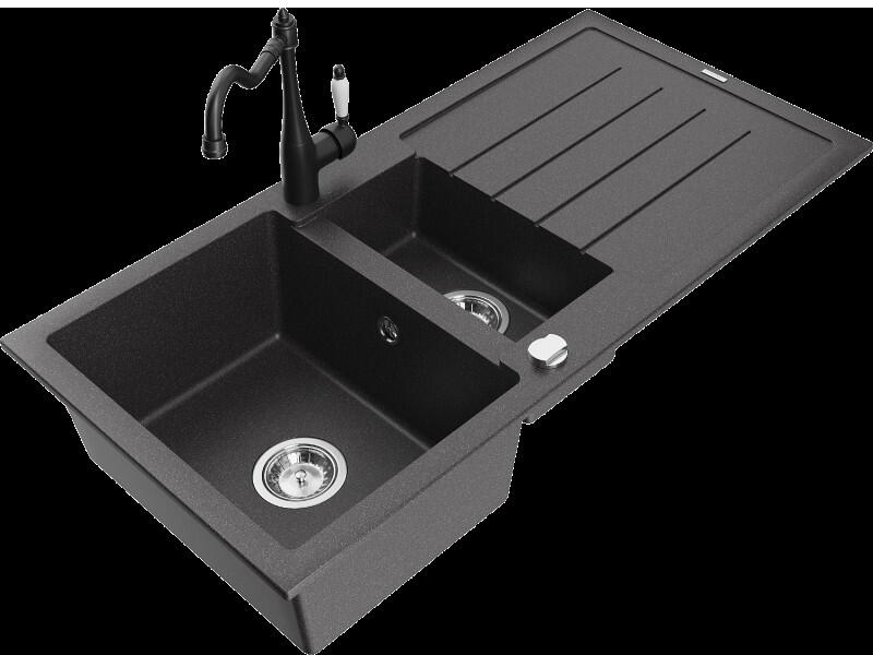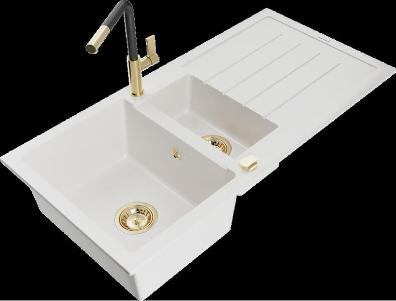 Matias konyhai mosogató: Gyártó: Mexen Sorozat: Matias Modell: 1,5-kamrás lefolyóval Beépítés: felülről a munkalapba való beágyazáshoz Hossz: 900 mm Szélesség: 505 mm Magasság: 200 mm Kamra mélysége: 180 mm (nagyobb), 115 mm (kisebb) Kamra mérete: 435x335 mm (nagyobb), 345x150 mm (kisebb) Lefolyó átmérője: 90 mm Szifon + automatikus leeresztő csavar Anyaga: gránit (80% gr