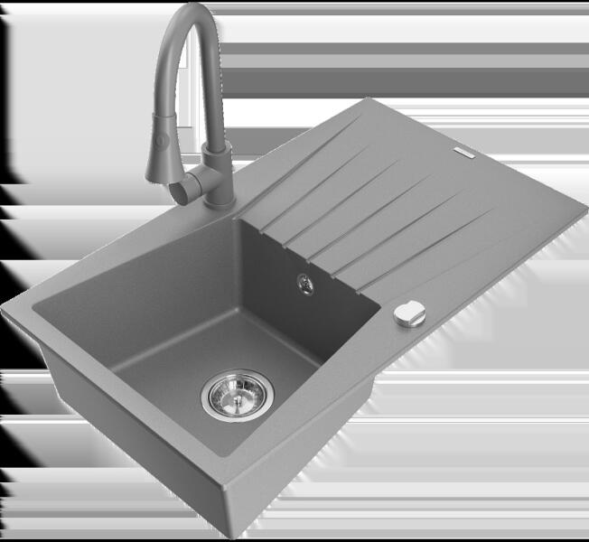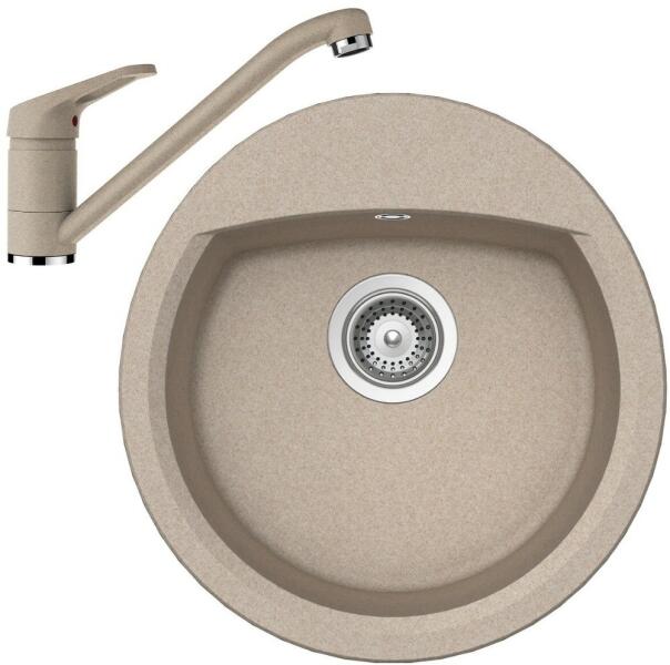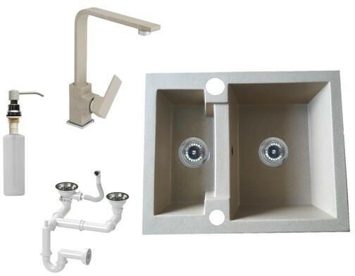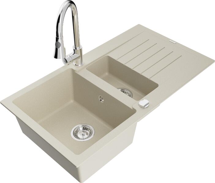 1.5 medencés bézs gránit mosogató, ami egyszerre kínálja a másfél medencés mosogatók előnyeit és a helytakarékos megoldást. Teljes készlet, ami tartalmazza a mosogatót, csaptelepet, szifont készletet, és a mosogatószer adagolót. A kisebb medence egyaránt alkalmas gyümölcsmosásra vagy csepegtetőként is használható. Modern formavilág, letisztult, egyenes élek és ezált