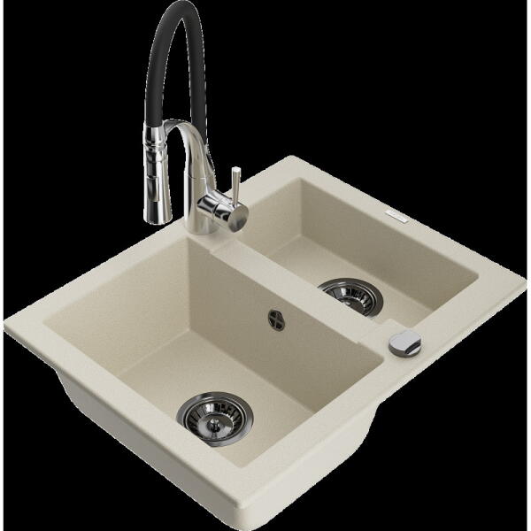 Mexen Mario, gránit mosogató 820x436x161 mm, 2 kamrás és Aster mosogató csaptelep, fekete, 6504-77-73450-70-B Gyártó: Mexen Sorozat: Mario + Aster Mosogató: Méretek: 820x436x161 mm Kamra mélysége: 151 mm Kamra méretei: 356x336 mm Lefolyó átmérője: ø90 mm Fekete szín Típus: 2 kamrás Típus: felülről az asztal munkalapjába süllyesztve Anyaga: gránit (80% gránit adalékanyag