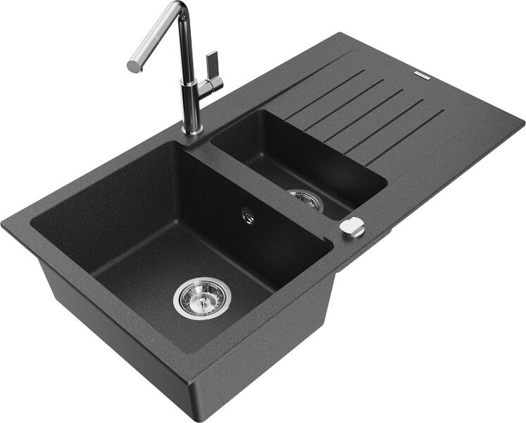 NERO Malta gránit mosogató, ami egyesíti a praktikus megoldást a bőséges helykínálattal és a harmonikus designnal. Méretes, 36 x 38 cm-es, medencével és kellően nagy csepegtető résszel rendelkezik, arányosan kialakítva. Minden igényt kielégít ami egy mosogatótól elvárható, amihez mindössze 78 cm hely szükséges. Egyenes és hajlított vonalvezetés harmonikus keveréke je