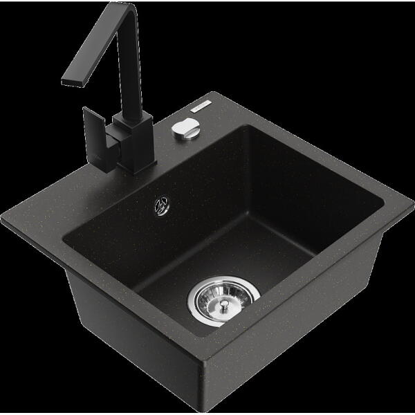 Mexen Pablo, gránit mosogató 752x436x161 mm, 1 kamrás és Rita króm csaptelep, fekete-ezüst metál, 6510-73-670300-00 Gyártó: Mexen Sorozat: Pablo Mérete: 752x436x161 mm Kamra mélysége: 151 mm Kamra méretei: 356x332 mm Lefolyó átmérője: ø90 mm Szín: fekete - ezüst metál Típus: 1 kamrás csepegtetővel Típus: az asztallapba ágyazva Anyaga: gránit (80% gránit adalékanyag 20