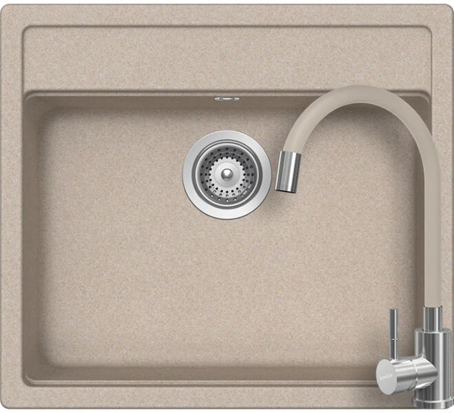 Schock Nemo N-100 konyhai mosogatótálca Cristalite Sabbia 570 x 510 mm, gránit, hagyományos beépítés, homok munkalapba beépíthető, egymedencés, csepegtető nélküli, ideálisan illeszkedik a minimum 60 cm-es alsószekrényhez. A csaptelep helye előre elkészített, könnyedén áttörhető. A csomagban találja a használati útmutatót, amely részletes leírást ad a csaptelep hely