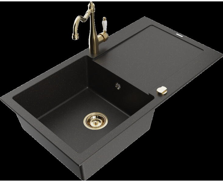 Mexen Cesar, gránit mosogató 775x470x190 mm, 1 kamrás, fekete, fekete szifonnal és arany Rita mosogató csaptelep, 6514-77-670300-50-B A konyhai mosogató műszaki adatai: Gyártó: Mexen Sorozat: Cesar Modell: 1 kamrás Felszerelés: munkalapra Fekete szín Felület: sima Hossza 775 mm Szélesség 470 mm Magasság: 190 mm Kamra mélysége: 180 mm Kamra mérete: 410x355 mm Lefolyó átmérőj
