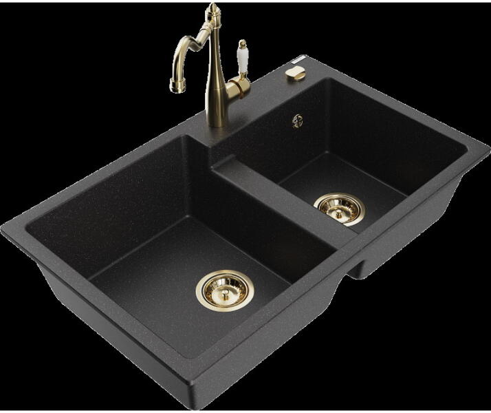 Mario konyhai mosogató: Méretek: 820x436x161 mm Kamra mélysége: 151 mm Kamra méretei: 356x336 mm Lefolyó átmérője: ø90 mm Típus: 2 kamrás Típus: felülről a munkalapba süllyesztve Anyaga: gránit (80% gránit adalékanyag 20% gyanta) Túlfolyó lyuk: igen Lyukak: 2 (1 x mosogató csaptelep, 1 x automatikus leeresztő csavar vezérlés) Nagy ellenállás a karcolásokkal és elszíne