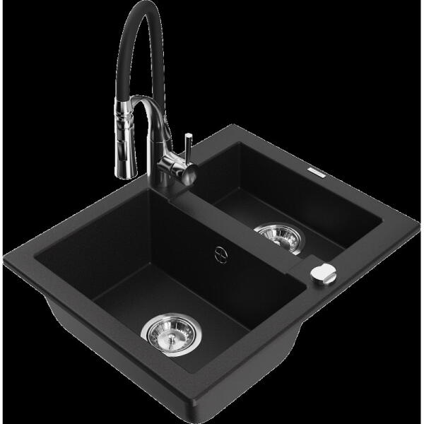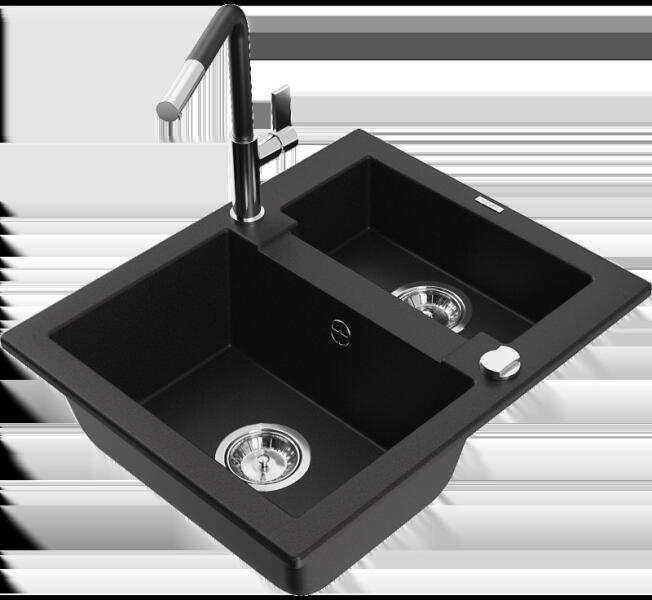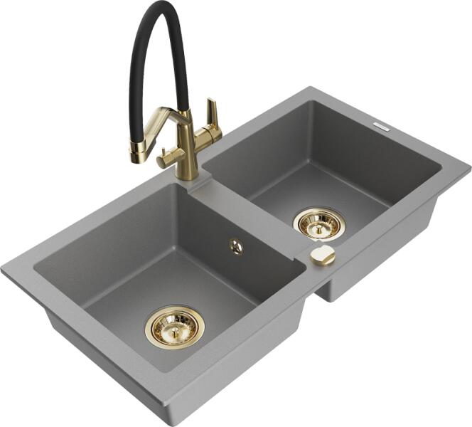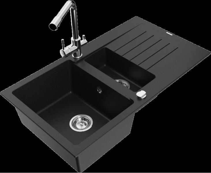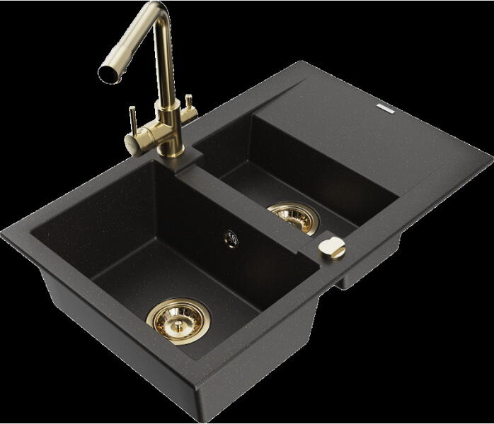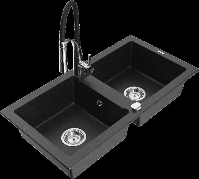Mexen Mario konyhai mosogató: Méretek: 820x436x161 mm Kamra mélysége: 151 mm Kamra méretei: 356x336 mm Lefolyó átmérője: ø90 mm Típus: 2 kamrás Típus: felülről az asztal munkalapjába süllyesztve Anyaga: gránit (80% gránit adalékanyag 20% gyanta) Túlfolyó lyuk: igen Lyukak: 2 (1 x mosogató csaptelep, 1 x automatikus leeresztő csavar vezérlés) Nagy ellenállás a karc