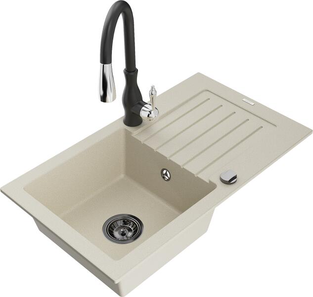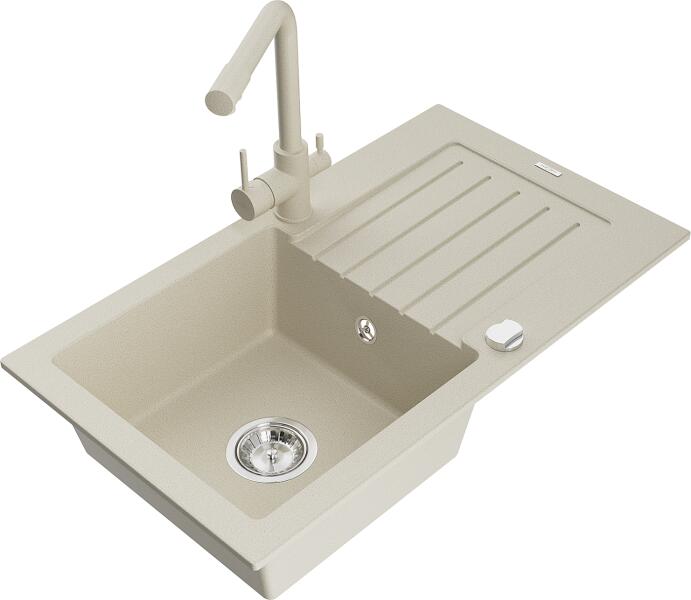 Mexen Pablo, gránit mosogató 752x436x161 mm, 1 kamrás és Duero bézs csaptelep, bézs, 6510-69-671600-69 Gyártó: Mexen Sorozat: Pablo Mérete: 752x436x161 mm Kamra mélysége: 151 mm Kamra méretei: 356x332 mm Lefolyó átmérője: ø90 mm Szín: bézs Típus: 1 kamrás csepegtetővel Típus: az asztallapba ágyazva Anyaga: gránit (80% gránit adalékanyag 20% gyanta) Túlfolyó lyuk: igen