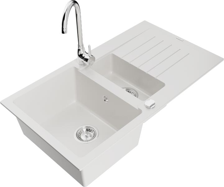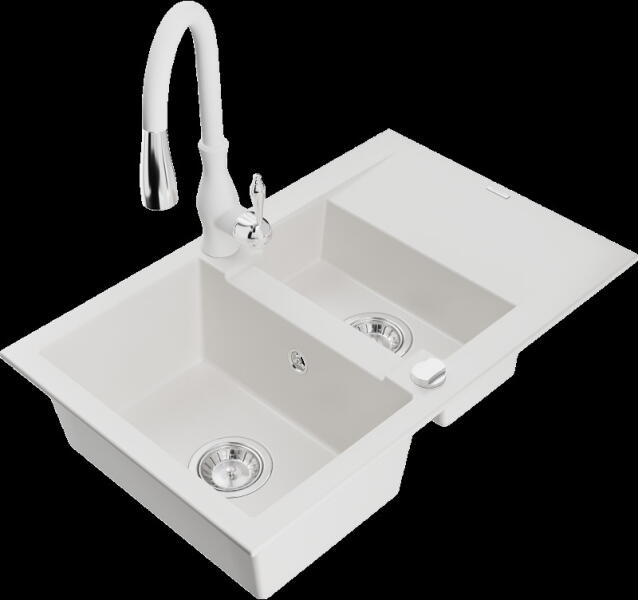 Mexen Matias, 1,5 kamrás gránit mosogató 90x50 cm-es csepptálcával Telma konyhai csapteleppel, fehér, 6502-20-670200-00 Mosogató: Termékkód: 6502901505-20 Mérete: 900x505x200 mm Kamra mélysége: 180 mm (nagyobb), 115 mm (kisebb) Kamra méretei: 435x335 mm (nagyobb), 345x150 mm (kisebb) Lefolyó átmérője: ø90 mm Típus: 1,5-kamrás, rövid csepegtetőtálcával Típus: Az asztallapba