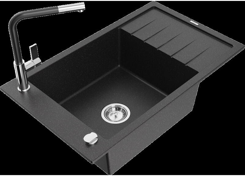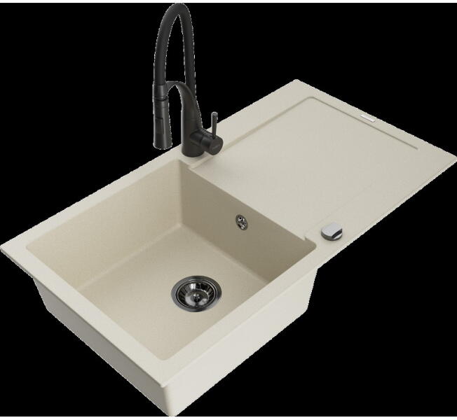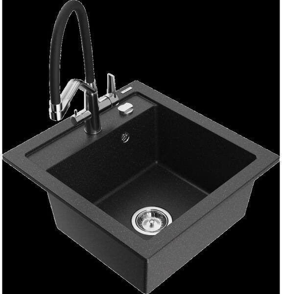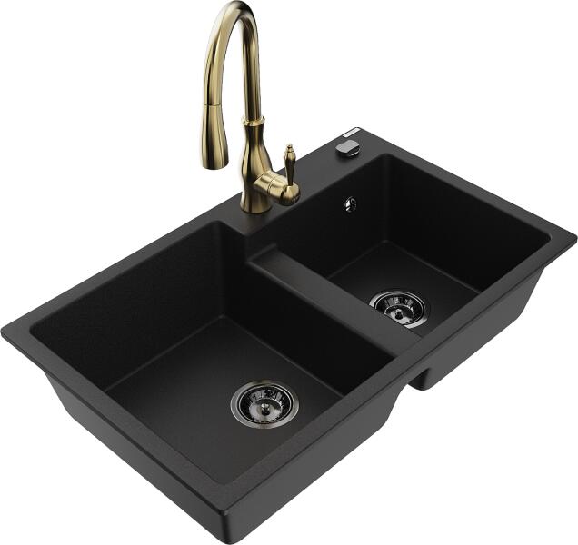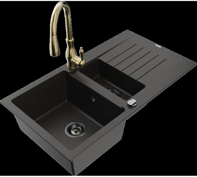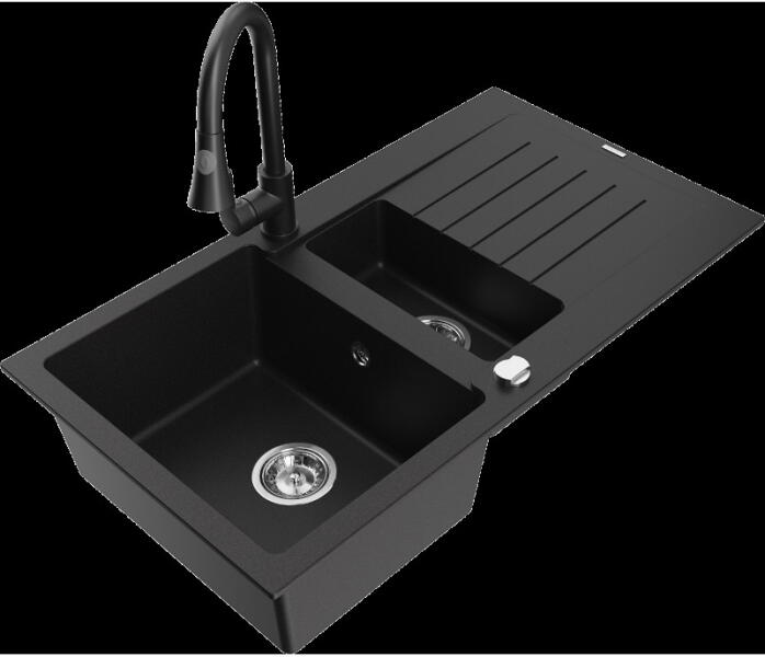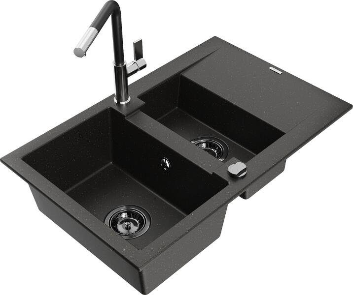 Mexen Tomas, gránit mosogató 800x500x190 mm, 2 kamrás és Savita mosogató csaptelep, fekete, 6516-77-672601-50-B A konyhai mosogató műszaki adatai: Gyártó: Mexen Sorozat: Tomas Modell: 2-kamrás csepptálca nélkül Beépítés: a munkalapba való beágyazáshoz Fekete szín Felületkezelés: sima Hossza 800 mm Szélesség 500 mm Magasság: 190 mm Kamra mélysége: 180 mm (nagyobb), 180 m