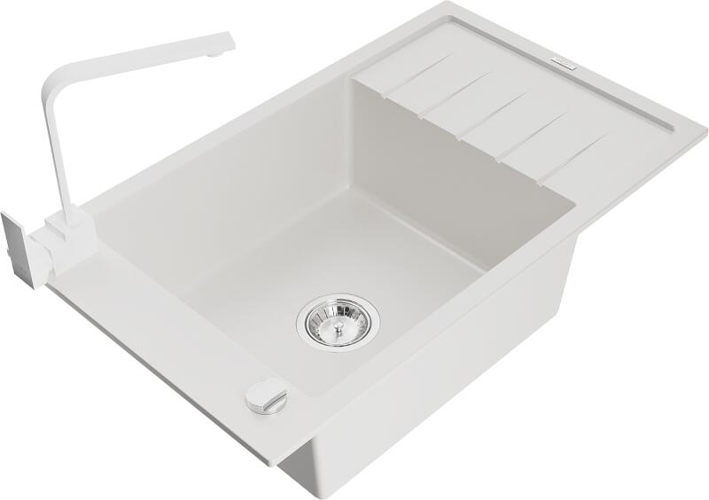 Mexen Elias, gránit mosogató gránit 795x480x200 mm, 1 kamrás, fehér króm szifonnal és fehér Rita mosogató csaptelep, 6511-20-670300-20 Gyártó: Mexen Sorozat: Elias Modell: 1 kamrás, rövid leeresztővel Felszerelés: munkalapra Fehér szín Felületkezelés: sima Hossza 795 mm Szélesség 480 mm Magasság: 200 mm Kamra mélysége: 190 mm Kamra mérete: 465x420 mm Lefolyó átmérője: