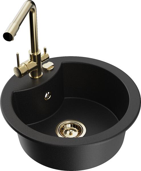 Mexen Diego, 1 kamrás gránit mosogató 488x488x167 mm, Duero arany csaptelep, fekete, 6512-77-671600-50 Gyártó: Mexen Sorozat: Diego Modell: 1 kamrás Felszerelés: munkalapra Fekete szín Felület típusa : sima Hossza 488 mm Szélesség 488 mm Magasság: 167 mm Kamra mélysége: 157 mm Kamra mérete: 406 mm Lefolyó átmérője: 90 mm Szifon + automatikus leeresztő Anyaga: gránit (80% gr