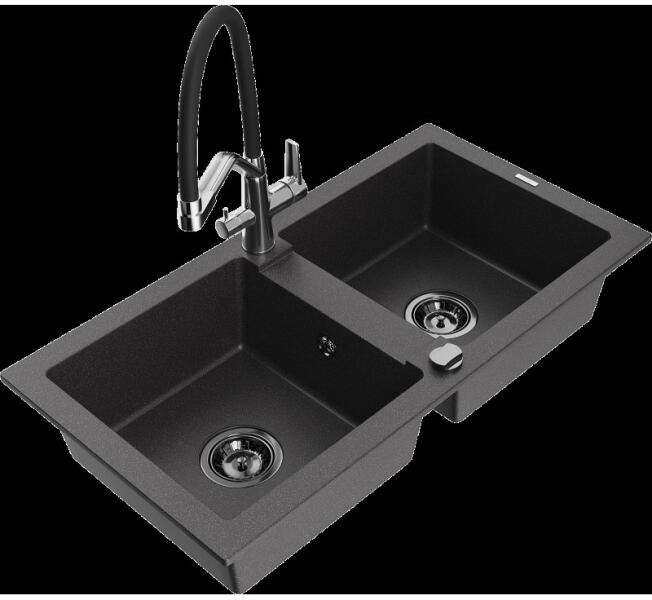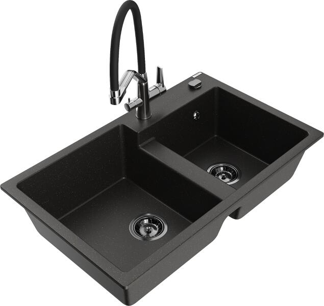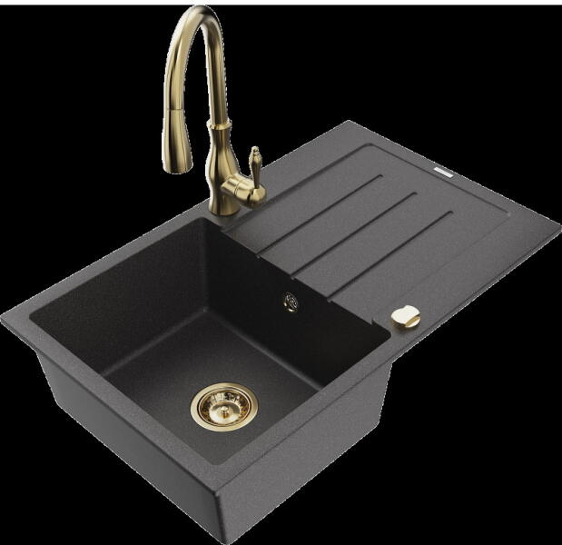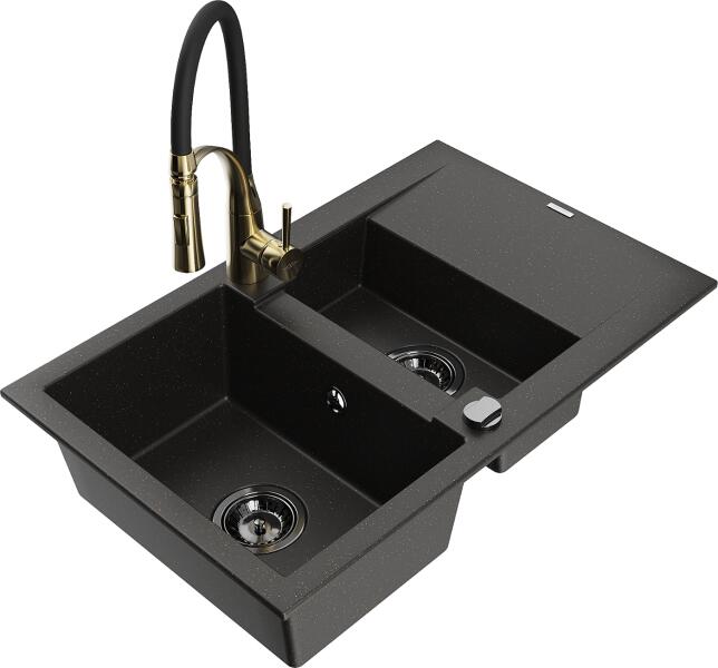 Mexen Tomas, 2 kamrás gránit mosogató 800x500x190 mm és konyhai csaptelep Duo, fekete-arany metál, 6516-75-671701-07-B A konyhai mosogató műszaki adatai: Gyártó: Mexen Sorozat: Tomas Modell: 2-kamrás csepptálca nélkül Felszerelés: munkalapra Szín: fekete - arany metál Felület: sima Hossza 800 mm Szélesség 500 mm Magasság: 190 mm Kamra mélysége: 180 mm (nagyobb), 180 mm (kiseb