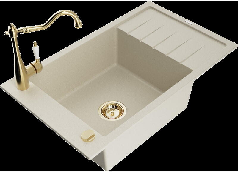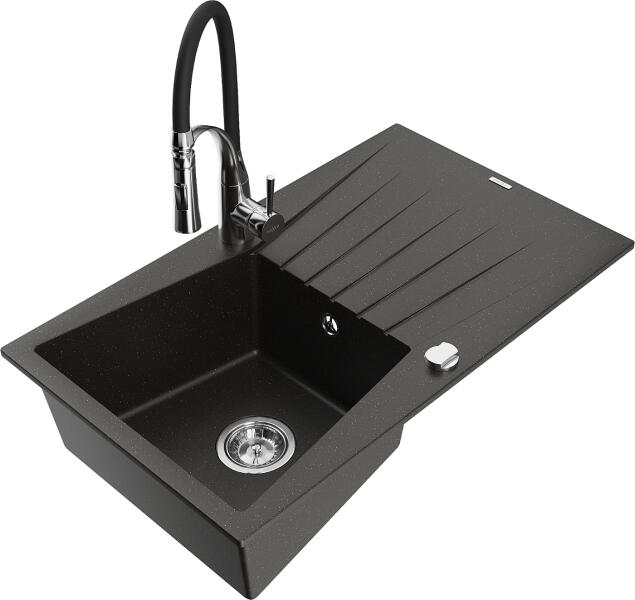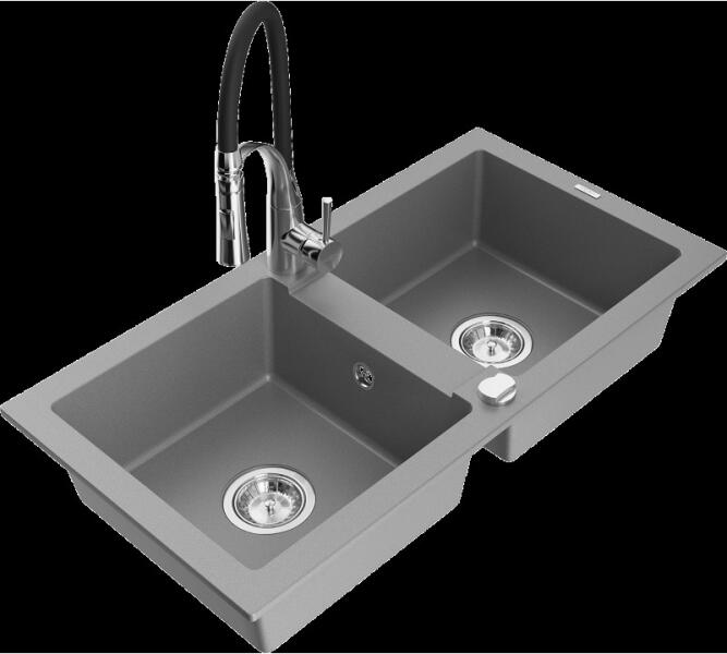 Mexen Gaspar konyhai mosogató: Gyártó: Mexen Sorozat: Gáspár Modell: 1,5-kamrás, rövid csepegtetővel Beépítés: felülről a munkalapba süllyesztve Méretek: 737x475x177 mm Kamra mélysége: 162 mm (nagyobb), 102 mm (kisebb) Kamra mérete: 395x272 mm (nagyobb), 375x182 mm (kisebb) Lefolyó átmérője: 90 mm Szifon + automatikus leeresztő csavar Anyaga: gránit (80% gránit - kő, 20%