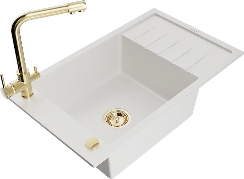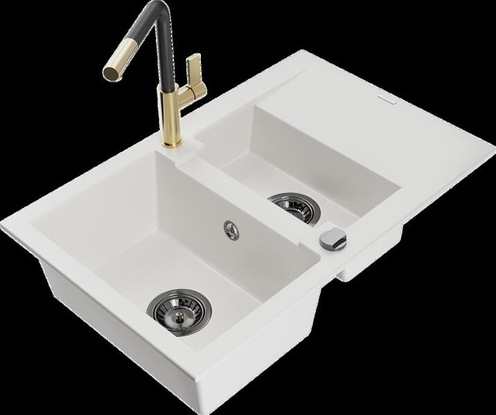 Mexen Elias, 1 kamrás gránit mosogató lefolyóval 795x480x200 mm és Duero arany csapteleppel, fehér, 6511-20-671600-50 Elias konyhai mosogató: Fehér szín Mérete: 795x480x200 mm Kamra mélysége: 190 mm Kamra méretei: 465x420 mm Lefolyó átmérője: ø90 mm Típus: 1 kamrás, rövid csepegtetővel Típus: a pultba süllyesztve Anyaga: gránit (80% gránit adalékanyag 20% gyanta) Túlfol