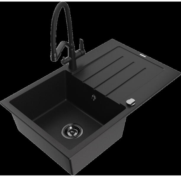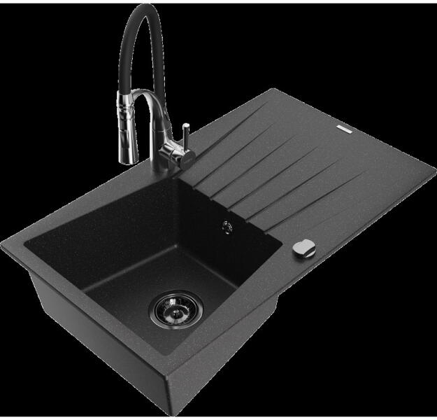 Mexen Kevin, gránit mosogató 586x458x190 mm, 1 kamrás és Rita króm csaptelep, fekete foltos, 6517-76-670300-00 Gyártó: Mexen Sorozat: Kevin Modell: 1 kamrás, rövid leeresztővel Felszerelés: munkalapra Hossza 586 mm Szélesség 458 mm Magasság: 190 mm Kamra mérete: 378x374 mm Kamra mélysége: 175 mm A lefolyó átmérője: Ø 90 mm Szifon + automatikus leeresztő csavar Anyaga: gráni