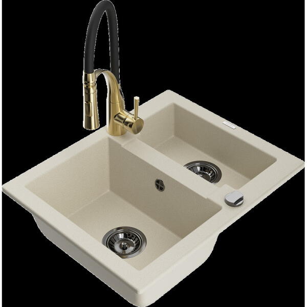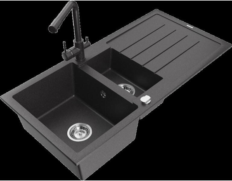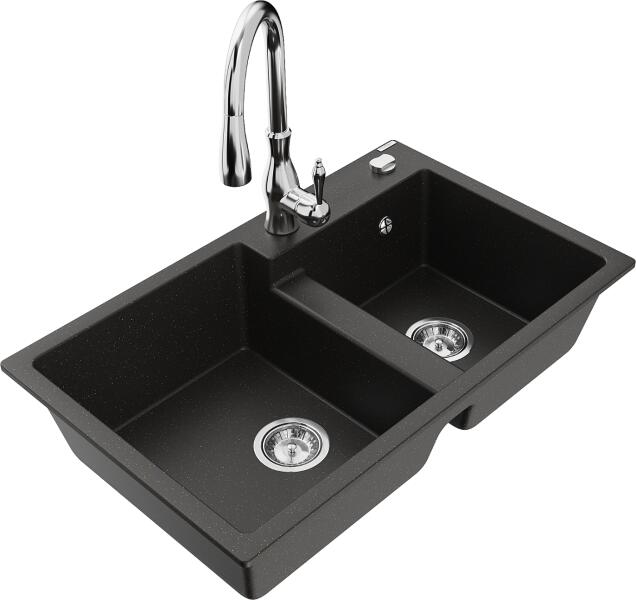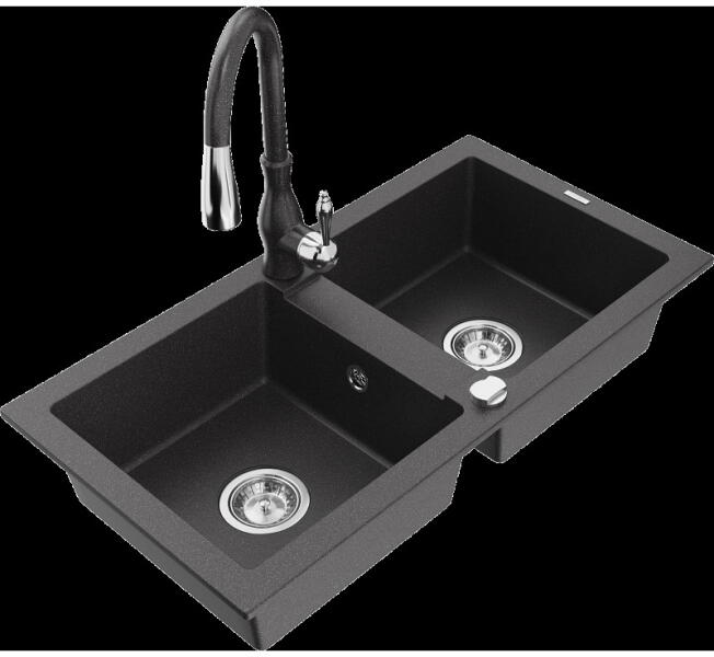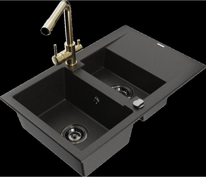Mexen Tomas, gránit mosogató 800x500x190 mm, 2 kamrás és Savita mosogató csaptelep, fekete-arany metál, 6516-75-672601-00 A konyhai mosogató műszaki adatai: Gyártó: Mexen Sorozat: Tomas Modell: 2-kamrás csepptálca nélkül Beépítés: a munkalapba való beágyazáshoz Szín: fekete - arany metál Felületkezelés: sima Hossza 800 mm Szélesség 500 mm Magasság: 190 mm Kamra mélysé