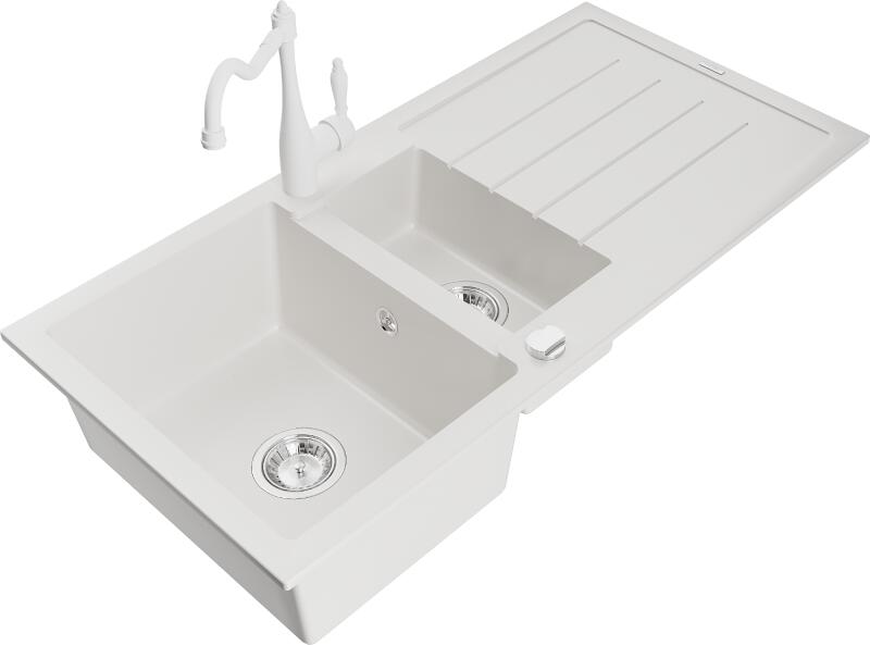 Mexen Andres, gránit mosogató 1000x500x200 mm, 1,5 kamrás és mosogató csaptelep Carla, fehér, 6515-20-670700-20 Gyártó: Mexen Sorozat: Andres Modell: 1,5-kamrás lefolyóval Felszerelés: munkalapra Fehér szín Felületkezelés : sima Hossza 1000 mm Szélesség 500 mm Magasság: 200 mm Kamra mélysége: 190 mm (nagyobb), 115 mm (kisebb) Kamra mérete: 430x330 mm (nagyobb), 340x170 mm (kis