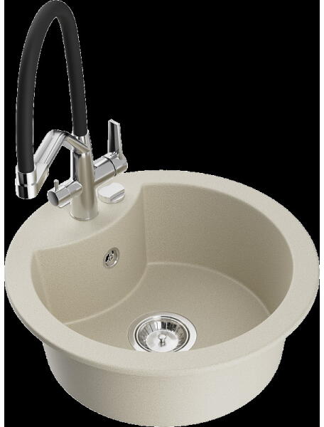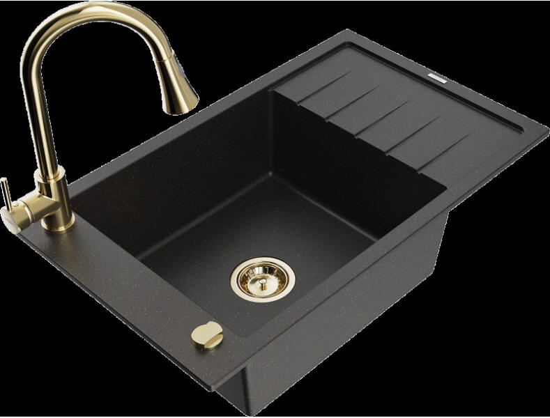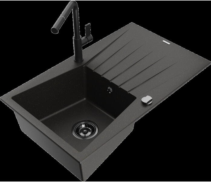 Mexen Milo, 1 kamrás gránit mosogató 43,5x41 cm és konyhai csaptelep Telma, fekete-ezüst, 6505-73-670200-70 Mosogató: Termékkód: 6505441000-73 Mérete: 435x410x171 mm Kamra mélysége: 161 mm Kamra méretei: 375x280 mm Lefolyó átmérője: ø90 mm Típus: 1 kamrás Típus: Az asztallapba süllyesztett Szín: fekete, ezüst pöttyökkel Anyaga: gránit (80% gránit adalékanyag 20% gyanta)
