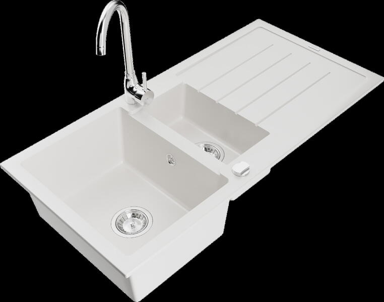 Mexen Andres, gránit mosogató 1000x500x200 mm, 1,5 kamrás, fehér fekete szifonnal és fekete Telma mosogató csaptelep, 6515-20-670200-70 Gyártó: Mexen Sorozat: Andres Modell: 1,5-kamrás lefolyóval Felszerelés: munkalapra Fehér szín Felületkezelés : sima Hossza 1000 mm Szélesség 500 mm Magasság: 200 mm Kamra mélysége: 190 mm (nagyobb), 115 mm (kisebb) Kamra mérete: 430x330 mm (n