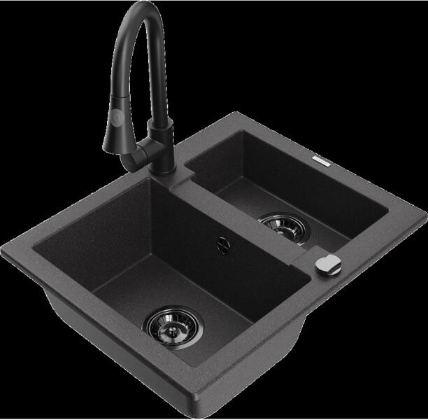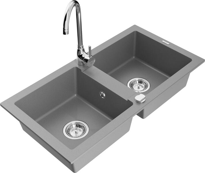 Mexen Mario, 2 kamrás gránit mosogató 82x44 cm konyhai csapteleppel Telma, szürke, 6504-71-670200-00 Mosogató: Termékkód: 6504822000-71 Mérete: 820x436x161 mm Kamra mélysége: 151 mm Kamra méretei: 356x336 mm Lefolyó átmérője: ø90 mm Típus: 2 kamrás Típus: Az asztallapba süllyesztett Szín: Szürke Anyaga: gránit (80% gránit adalékanyag 20% gyanta) Túlfolyó nyílás: Igen L