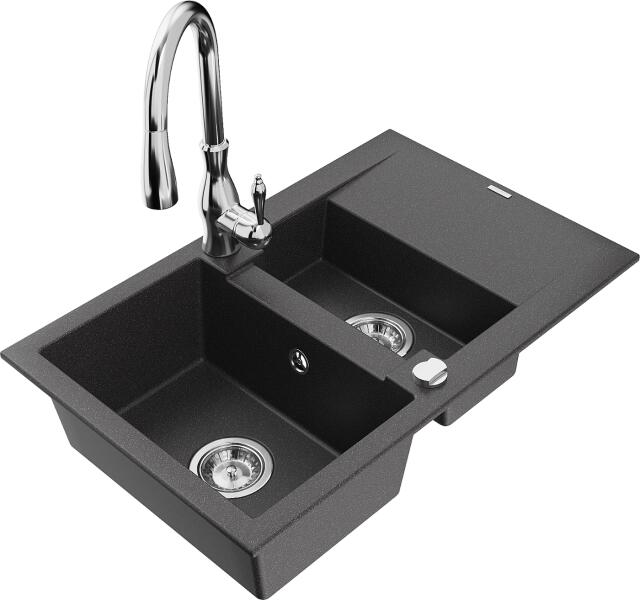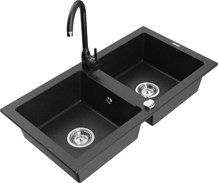 Mexen Mario, 2 kamrás gránit mosogató 82x44 cm konyhai csapteleppel Telma, fekete-ezüst, 6504-73-670200-70 Mosogató: Termékkód: 6504822000-73 Mérete: 820x436x161 mm Kamra mélysége: 151 mm Kamra méretei: 356x336 mm Lefolyó átmérője: ø90 mm Típus: 2 kamrás Típus: Az asztallapba süllyesztett Szín: fekete, ezüst pöttyökkel Anyaga: gránit (80% gránit adalékanyag 20% gyanta) T