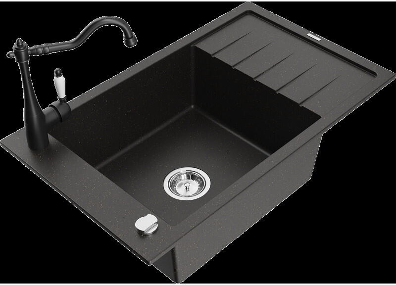 Mexen Pablo, 1 kamrás gránit mosogató csepegtetővel 75x44 cm Telma konyhai csapteleppel, fekete-arany, 6510-75-670200-70 Mosogató: Termékkód: 6510751010-75 Mérete: 752x436x161 mm Kamra mélysége: 151 mm Kamra méretei: 356x332 mm Lefolyó átmérője: ø90 mm Típus: 1 kamrás csepptálcával Típus: Az asztallapba süllyesztett Szín: fekete-arany Anyaga: gránit (80% gránit adalékanya