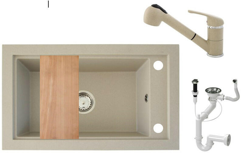 Panama gránit mosogató homokbézs színben, extra nagy medencével. A teljes készlet tartalmazza a mosogatót, a csaptelepet, a szifonkészletet automata dugókiemelővel és egy vágódeszkát. A medence mérete 51,7 x 31,6 cm, amiben szinte bármilyen méretű edény elfér. Modern megjelenésű, letisztult szögletes formavilág jellemzi, kiváló eleme lehet egy minimál vagy modern stílus