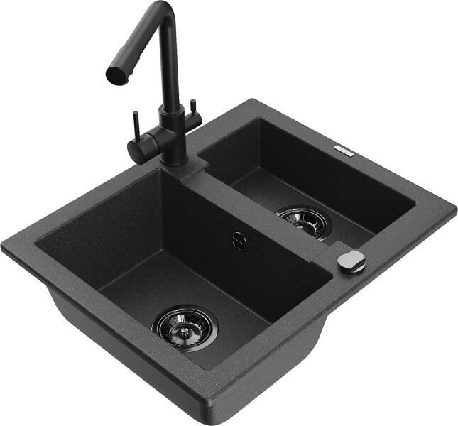 Mexen Carlos, 1,5 kamrás gránit mosogató 582x475x177 mm és Duero mosogató csaptelep, fekete pettyes, 6518-76-671600-70-B Mexen Carlos konyhai mosogató: Gyártó: Mexen Sorozat: Carlos Modell: 1,5-kamrás Beépítés: felülről a munkalapba süllyesztve Méretek: 582x475x177 mm Kamra mélysége: 162 mm (nagyobb), 102 mm (kisebb) Kamra mérete: 395x272 mm (nagyobb), 375x182 mm (kisebb) Lefoly