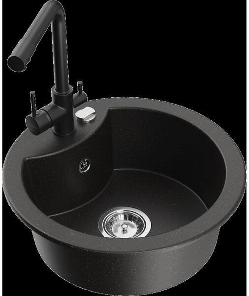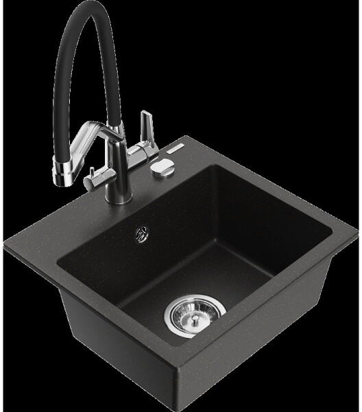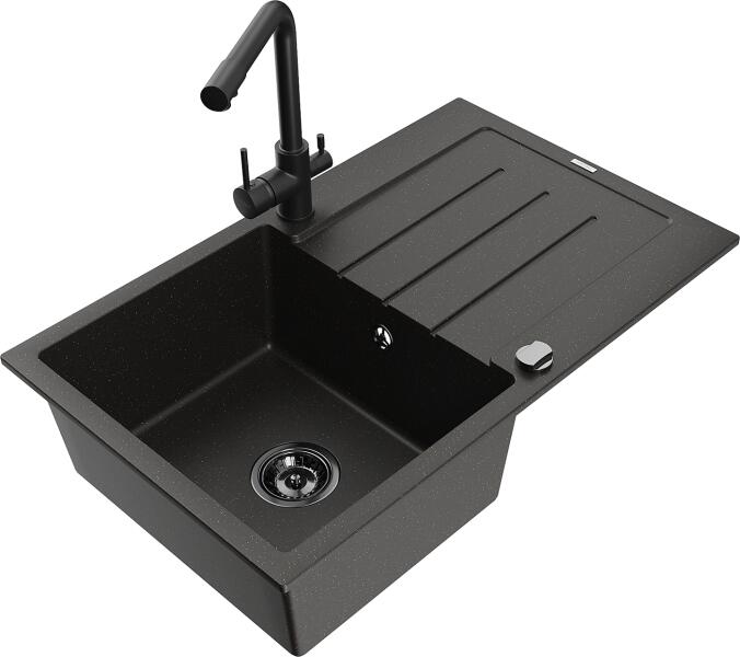 Mexen Enzo, gránit mosogató 576x465x174 mm, 1 kamrás, fekete foltos csaptelep Rita, fekete foltos, 6506-76-670300-76 Gyártó: Mexen Sorozat: Enzo Modell: 1 kamrás, rövid csepegtetővel Hossza 576 mm Szélesség 465 mm Magasság: 174 mm Szín: fekete foltos Kamra mélysége: 164 mm Kamra mérete: 395x320 mm Szifon + automatikus leeresztő csavar Anyaga: gránit (80% gránit - kő, 20% gyanta)