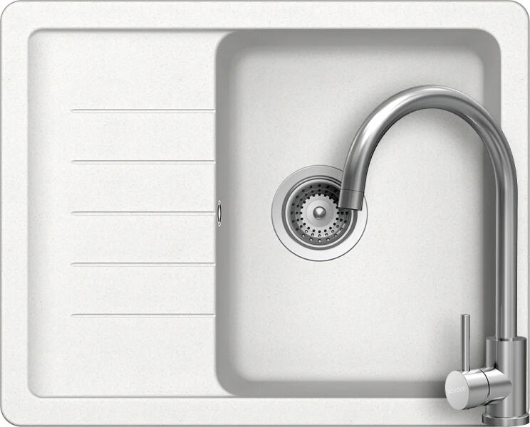 Schock Pinedo D-100XS konyhai mosogatótálca Cristalite Alpina 620 x 500 mm, gránit, megfordítható, hagyományos beépítés, fehér - munkalapba beépíthető, 1 medence és csepegtető, megfordítható, ideálisan illeszkedik a minimum 45 cm-es alsószekrényhez. A csaptelep vagy más tartozék helye előre elkészített, könnyedén áttörhető. A csomagban találja a használati útmutat