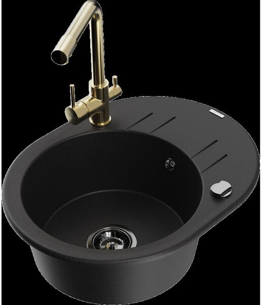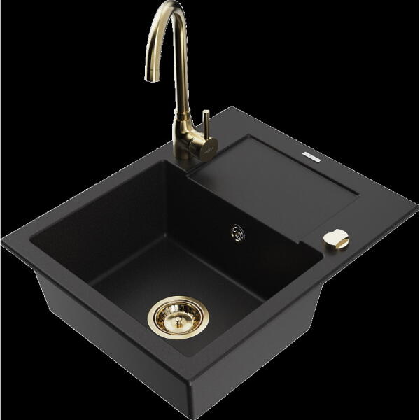 Mexen Bruno, 1 kamrás gránit mosogató lefolyóval 795x495x200 mm és fekete Duero csaptelep, fekete-arany metál, 6513-75-671600-70-B Mosogató: Mérete: 795x495x200 mm Kamra mélysége: 190 mm Kamra méretei: 440x360 mm Lefolyó átmérője: ø90 mm Típus: 1 kamrás csepegtetővel Típus: a munkalapba süllyesztve Szín: fekete - arany metál Anyaga: gránit (80% gránit adalékanyag 20% gyan