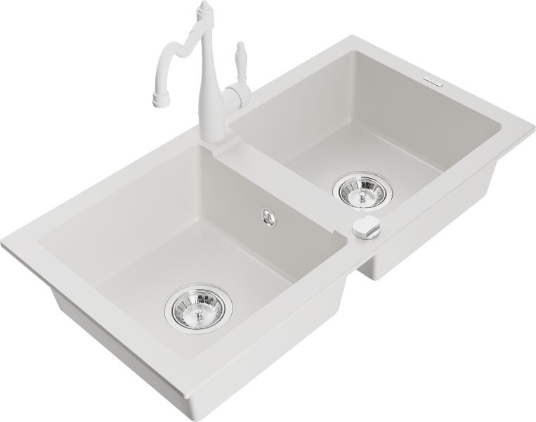 Mexen Mario, gránit mosogató 820x436x161 mm, 2 kamrás és mosogató csaptelep Carla, fehér, 6504-20-670700-20 Gyártó: Mexen Sorozat: Mario + Carlo Mosogató: Méretek: 820x436x161 mm Kamra mélysége: 151 mm Kamra méretei: 356x336 mm Lefolyó átmérője: ø90 mm Típus: 2 kamrás Típus: felülről az asztal munkalapjába süllyesztve Anyaga: gránit (80% gránit adalékanyag 20% gyanta) T
