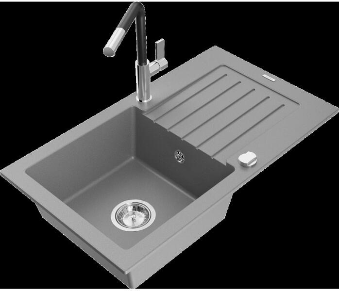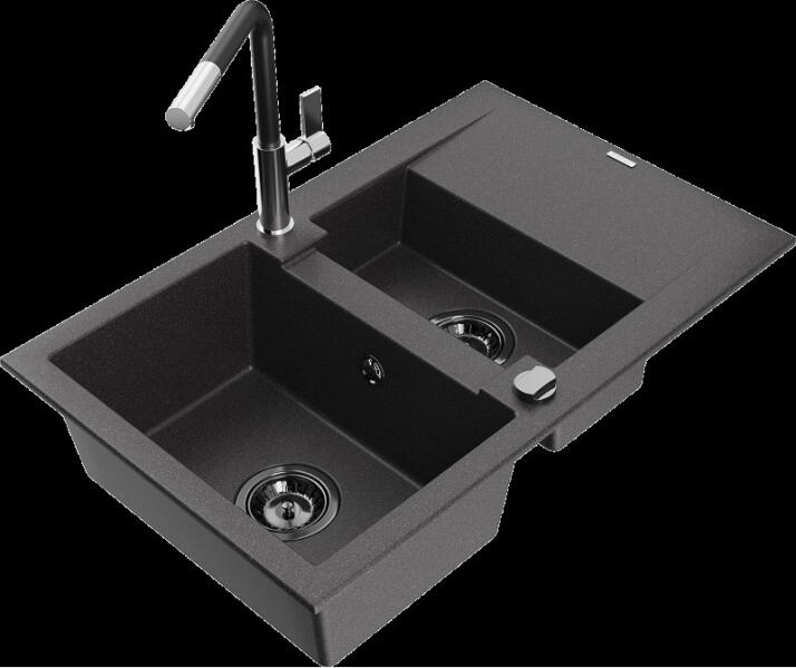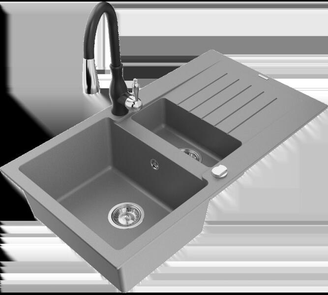 Mexen Tomas, gránit mosogató 800x500x190 mm, 2 kamrás és mosogató csaptelep Carla, szürke, 6516-71-670700-71 A konyhai mosogató műszaki adatai: Gyártó: Mexen Sorozat: Tomas Modell: 2-kamrás csepptálca nélkül Beépítés: a munkalapba való beágyazáshoz Szín: szürke Felület: sima Hossza 800 mm Szélesség 500 mm Magasság: 190 mm Kamra mélysége: 180 mm (nagyobb), 180 mm (kiseb