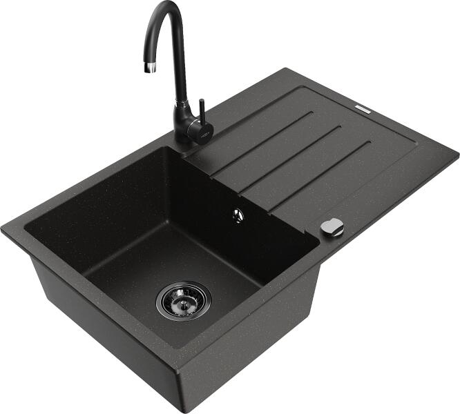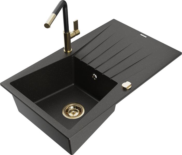 Mexen Bruno, 1 kamrás gránit mosogató lefolyóval 795x495x200 mm fekete konyhai csaptelep Telma, fekete - arany metál, 6513-75-670200-70-B Mosogató: Termékkód: 6513791010-75 Mérete: 795x495x200 mm Kamra mélysége: 190 mm Kamra méretei: 440x360 mm Lefolyó átmérője: ø90 mm Típus: 1 kamrás csepegtetővel Típus: a munkalapba süllyesztve Szín: fekete - arany metál Anyaga: gránit (
