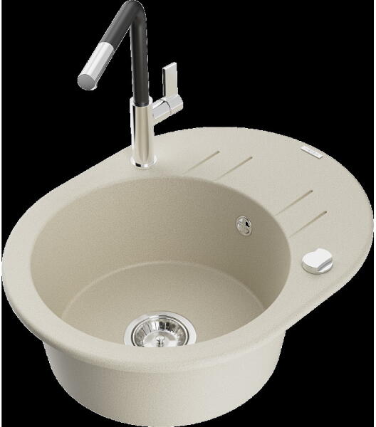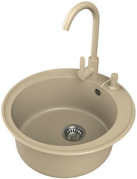 EOS Valero kör kialakítású gránit mosogató szett homokbézs színben. A készlet tartalmazza a szifont is, ami mosogatógépre is csatlakoztatható. Méreténél fogva ideális kisméretű konyhákba, ahol az okos helykihasználás lényeges. Kis mérete ellenére, a 37 cm-es belső átmrőnek köszönhetően nagyobb edények is elférnek benne. Már egy 45 cmszéles mosogató szekrénybe is