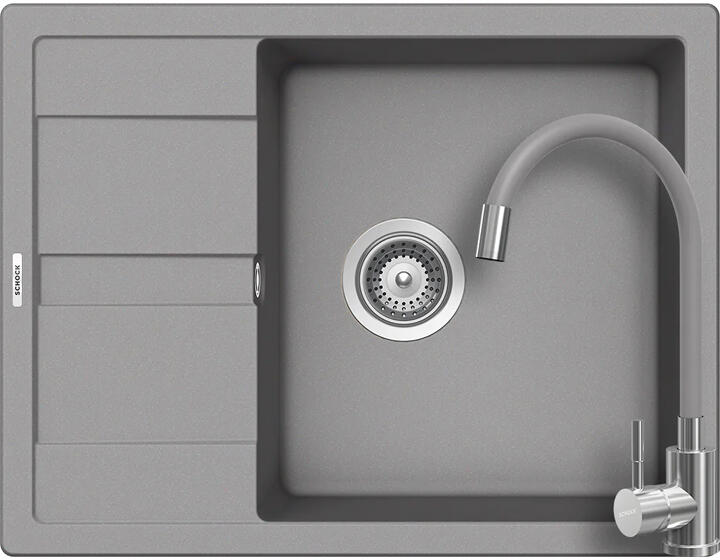 Schock Ronda D-100L konyhai mosogatótálca Cristalite Croma 650 x 500 mm, gránit, megfordítható, hagyományos beépítés, szürke munkalapba beépíthető, egymedencés, megfordítható, csepegtetővel ellátott, ideálisan illeszkedik a minimum 50 cm-es alsószekrényhez. A csaptelep helye előre elkészített, könnyedén áttörhető. A csomagban találja a használati útmutatót, amely r