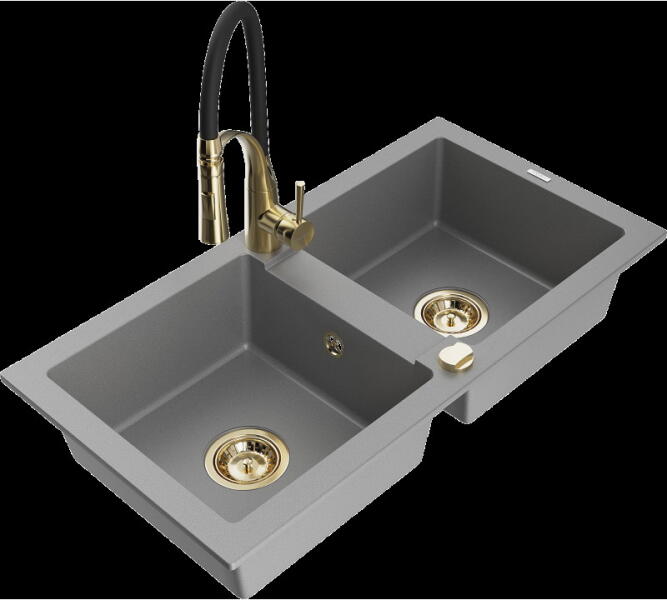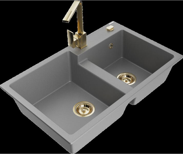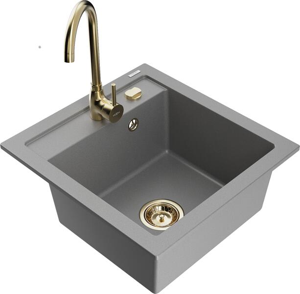 Mexen Vito, 1 kamrás gránit mosogató 520x490x210 mm, Telma arany csaptelep, szürke, 6503-71-670200-50 Mosogató: Mérete: 520x490x210 mm Kamra mélysége: 200 mm Kamra méretei: 410x360 mm Lefolyó átmérője: ø90 mm Típus: 1 kamrás Típus: Az asztallapba süllyesztett Szín: szürke Anyaga: gránit (80% gránit adalékanyag 20% gyanta) Túlfolyó nyílás: Igen Lyukak: (akkumulátor, gép