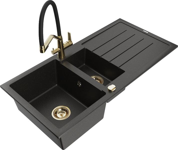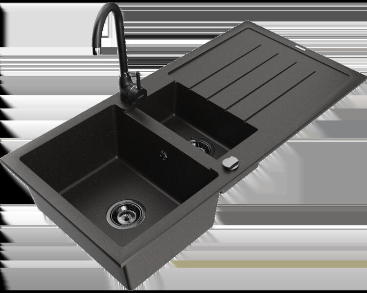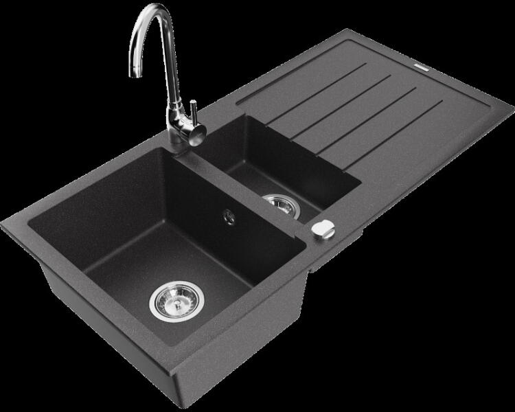 Mexen Andres, gránit mosogató 1000x500x200 mm, 1,5 kamrás Gyártó: Mexen Sorozat: Andres Modell: 1,5-kamrás lefolyóval Beépítés: felülről a munkalapba süllyesztve Hossza 1000 mm Szélesség 500 mm Magasság: 200 mm Kamra mélysége: 190 mm (nagyobb), 115 mm (kisebb) Kamra mérete: 430x330 mm (nagyobb), 340x170 mm (kisebb) Lefolyó átmérője: 90 mm Szifon + automatikus leeresztő csav