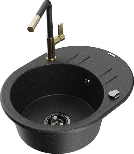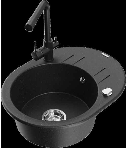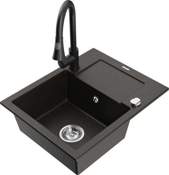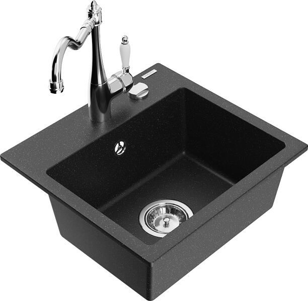 Mexen Milo, gránit mosogató 435x410x171 mm, 1 kamrás és Carla mosogató csaptelep, fekete-ezüst metál, 6505-73-670700-00 Milo konyhai mosogató: Gyártó: Mexen Szín: fekete - ezüst metál Méretek: 435x410x171 mm Kamra mélysége: 161 mm Kamra méretei: 375x280 mm Lefolyó átmérője: ø90 mm Típus: 1 kamrás Beépítés: felülről a pultba süllyesztve Anyaga: gránit (80% gránit ada