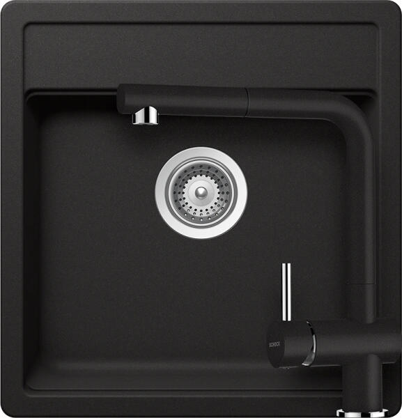 Schock Nemo N-100S konyhai mosogatótálca Cristalite Nero 490 x 510 mm, gránit, hagyományos beépítés, fekete munkalapba beépíthető, egymedencés, csepegtető nélküli, ideálisan illeszkedik a minimum 50 cm-es alsószekrényhez. A csaptelep helye előre elkészített, könnyedén áttörhető. A csomagban találja a használati útmutatót, amely részletes leírást ad a csaptelep hely