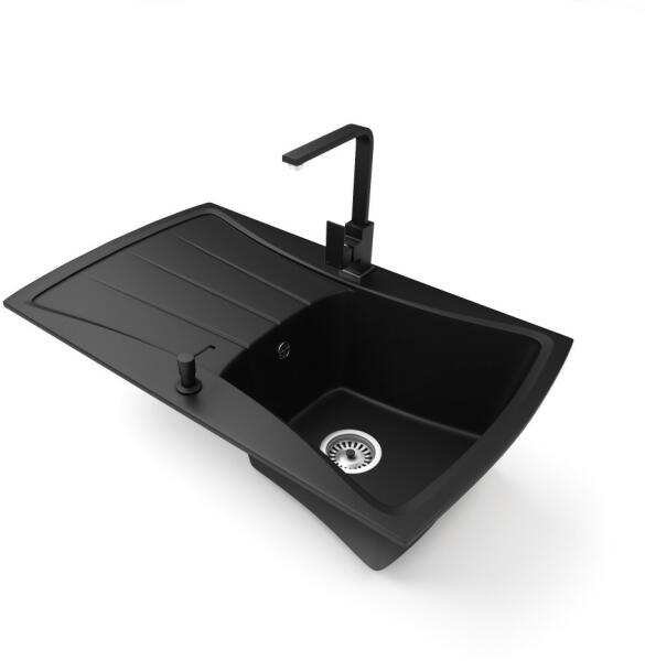 NERO Venezia gránit mosogató matt fekete színben. Egyedi és különleges formával tervezett egymedencés mosogató, kellően nagyméretű csepegtető résszel. A velencei gondolákat idéző, harmonikusan kialakított ívekkel a konyha esztétikus része, emellett anyagvastagságának köszönhetően rendkívül masszív konsktrukció. A mosogatón 2 lyuk található, egy a csaptelepnek és e