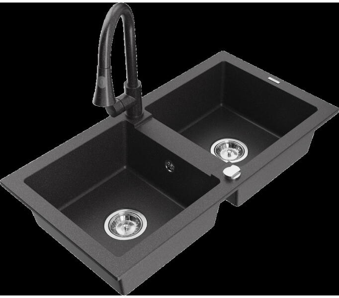 NERO Verso gránit mosogatótálca szemcsés fekete színben csapteleppel és automata dugókiemelővel. Kétmedencés, szimmetrikus elrendezésű mosogató, kellően nagyméretű medencékkel, a 75 cm-es szélesség egyszerre tágas és helytakarékos is. Letisztult formatervezés, kiemelkedő anyagvastagság jellemzi, ezáltal rendkívül masszív és ellenálló konstrukció. Anyaga 80% gránit
