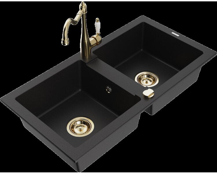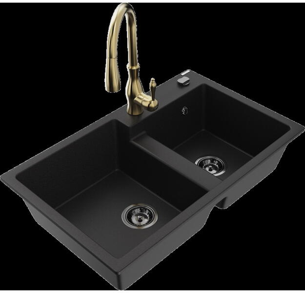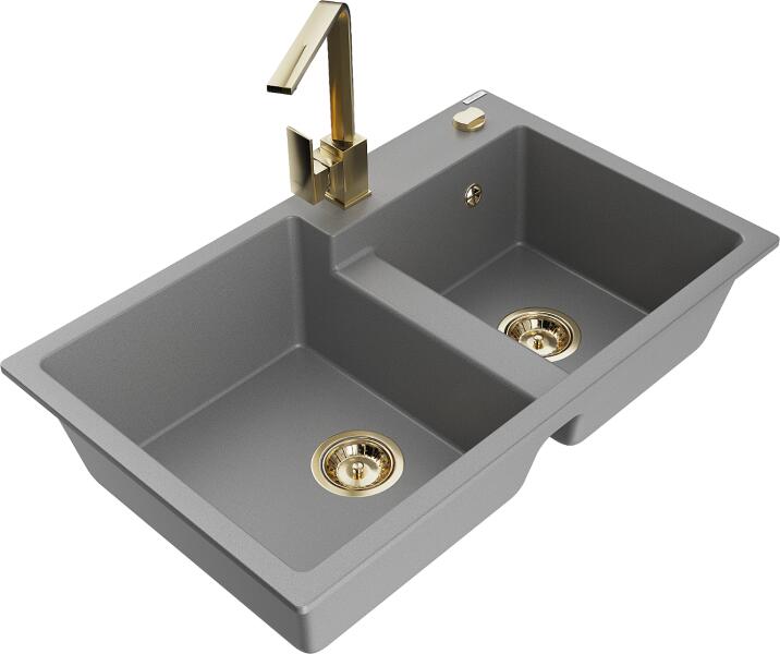 Mexen Tomas, gránit mosogató 800x500x190 mm, 2 kamrás és arany csaptelep Rita, szürke, 6516-71-670300-50 A konyhai mosogató műszaki adatai: Gyártó: Mexen Sorozat: Tomas Modell: 2-kamrás csepptálca nélkül Felszerelés: munkalapra Szín: szürke Felület: sima Hossza 800 mm Szélesség 500 mm Magasság: 190 mm Kamra mélysége: 180 mm (nagyobb), 180 mm (kisebb) Kamra mérete: 440x387 m