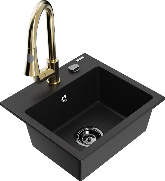 Mexen Milo konyhai mosogató: Gyártó: Mexen Sorozat: Milo Modell: 1 kamrás Beépítés: felülről a munkalapba süllyesztve Hossza 435 mm Szélesség 410 mm Magasság: 171 mm Kamra mélysége: 161 mm Kamra mérete: 375x280 mm Lefolyó átmérője: 90 mm Szifon + automatikus leeresztő csavar Anyaga: gránit (80% gránit - kő, 20% gyanta) Sima felület a könnyű tisztítás érdekében: igen